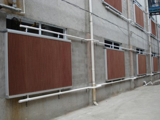 ZR濕簾降溫系統(tǒng)的降溫過程是在基核心-ZR紙墊內(nèi)完成的。在波紋的纖維紙表面有層薄薄的水膜,當室外干熱空氣被風機抽吸穿過紙墊時,水膜上的水會吸收空氣中的熱量進而蒸發(fā)在水蒸氣,這樣經(jīng)過處理后的涼爽濕潤的空氣就進入室內(nèi)了。這自然的過程猶如風吹過水面一樣。